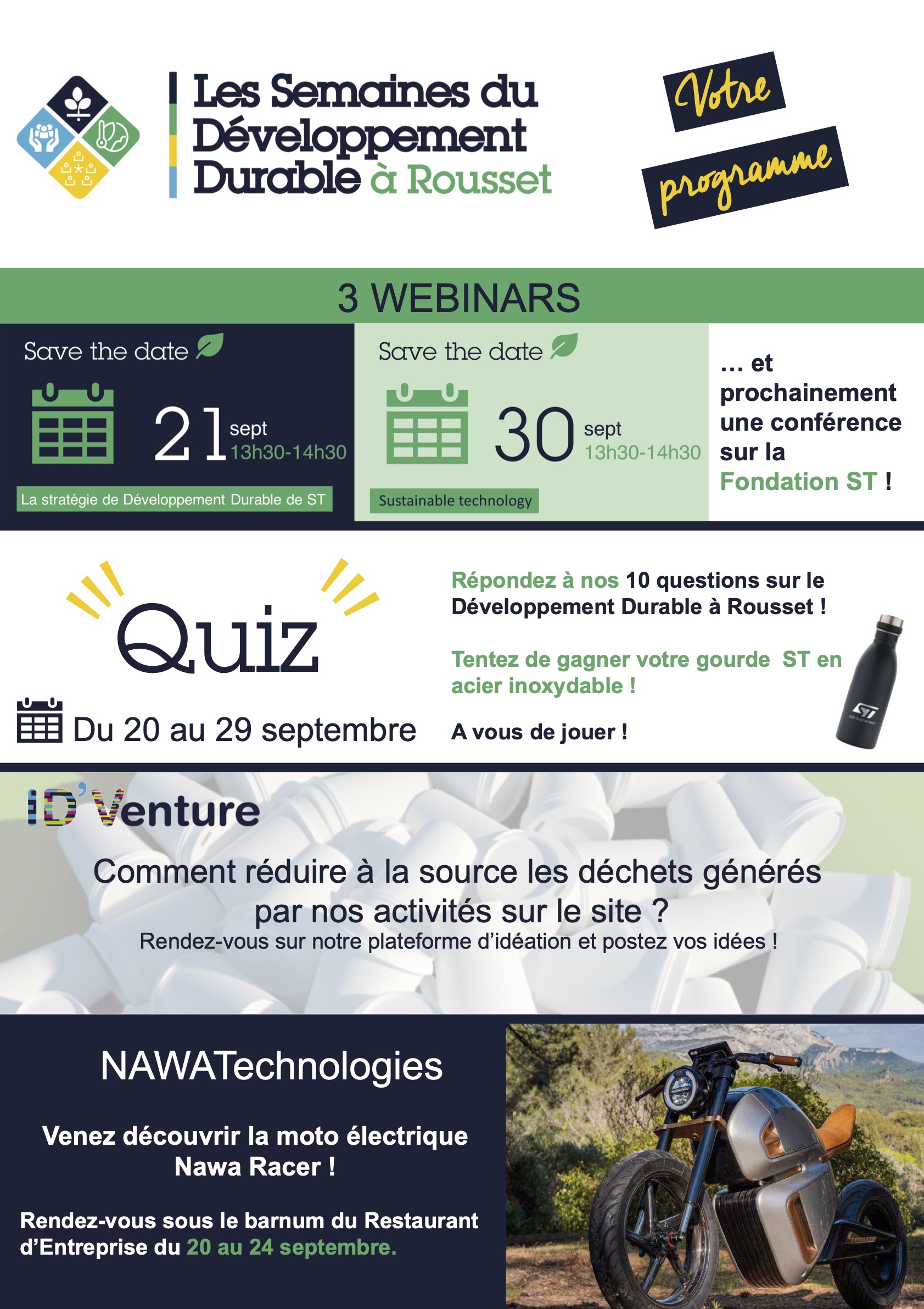 Actions : Mis en place de plusieurs campagnes visant à réduire la production de déchet en entreprise, création d’évènement en interne.